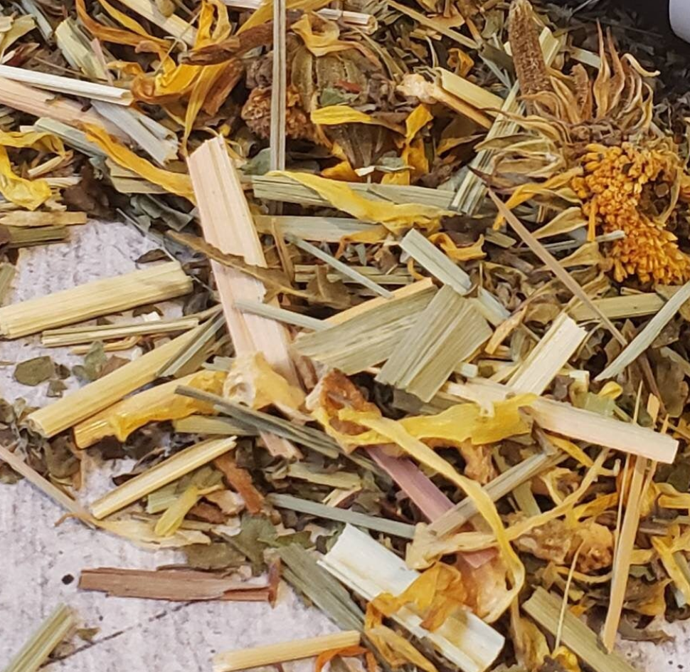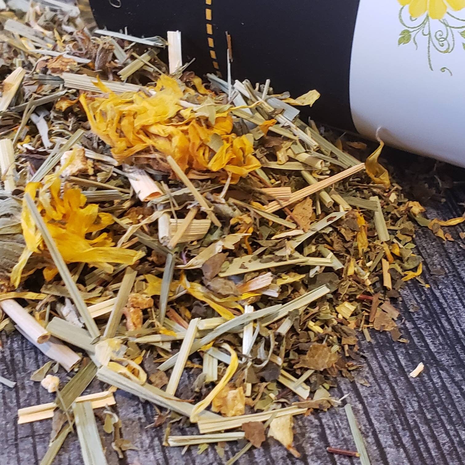 Contains: Green Rooibos, lemon balm (melissa leaf), lemongrass, lemon verbena, lemon peel, calendula flowers, stevia leaf
