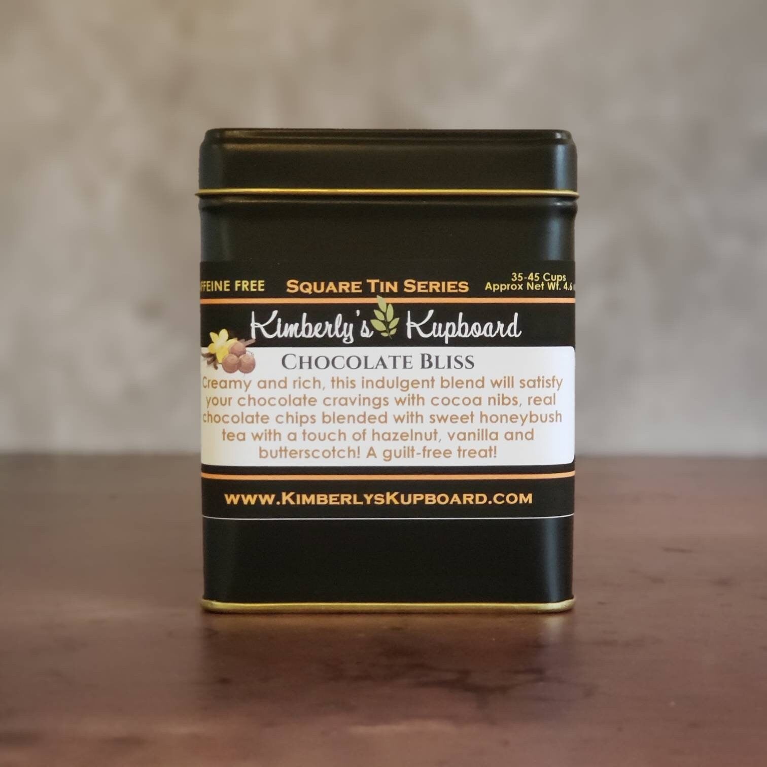 A dee-licious blend made with red honeybush tea (known for its subtle honey-like flavor), cocoa nibs, dark chocolate chips and butterscotch chips.