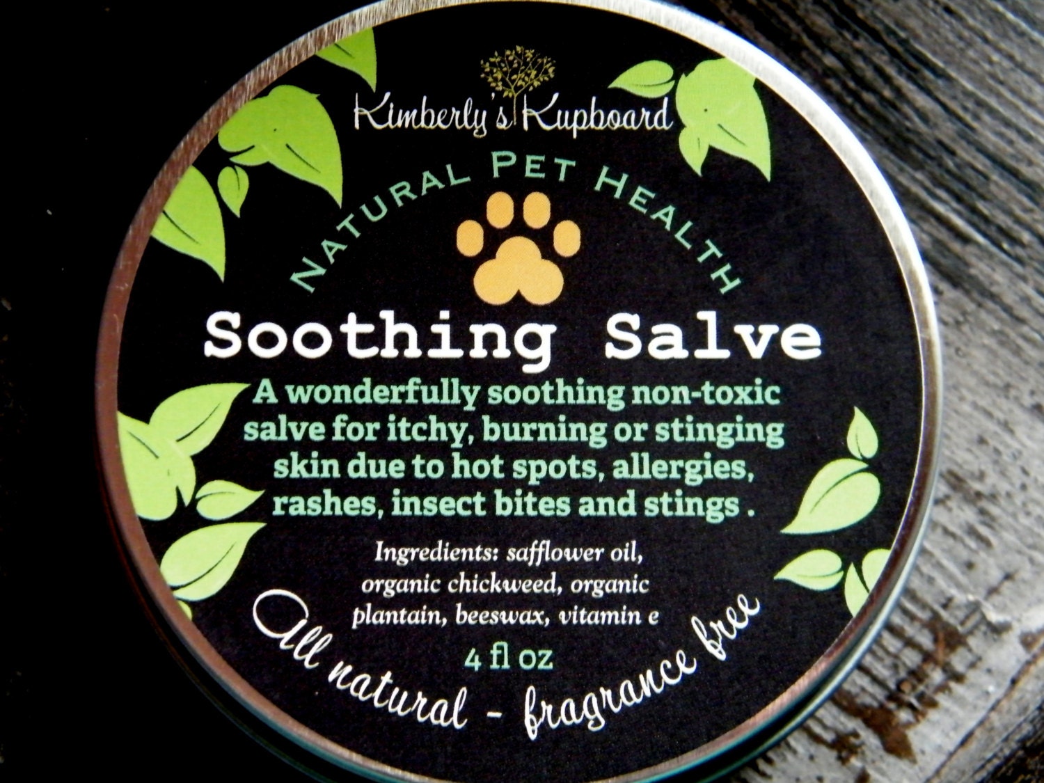 Soothing Dog Salve with Chickweed helps stop itching and heals cuts, rashes, bug bites, bee stings, hives, allergies and other skin irritations. Apply to affected area 2-3 times daily until healed. Also moisturizes and heals dry and cracked nose. This salve very gentle and REALLY works. Plus, it won’t offend doggie’s nose because it’s fragrance-free.